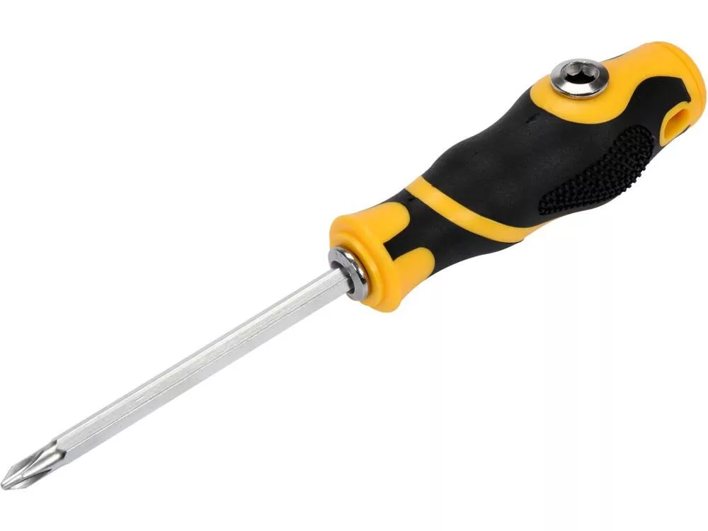 PH2x6mm csavarhúzó fordítható betéttel, króm vanádium acélból készült, markolat polipropilénből, hőre lágyuló gumival borítva.