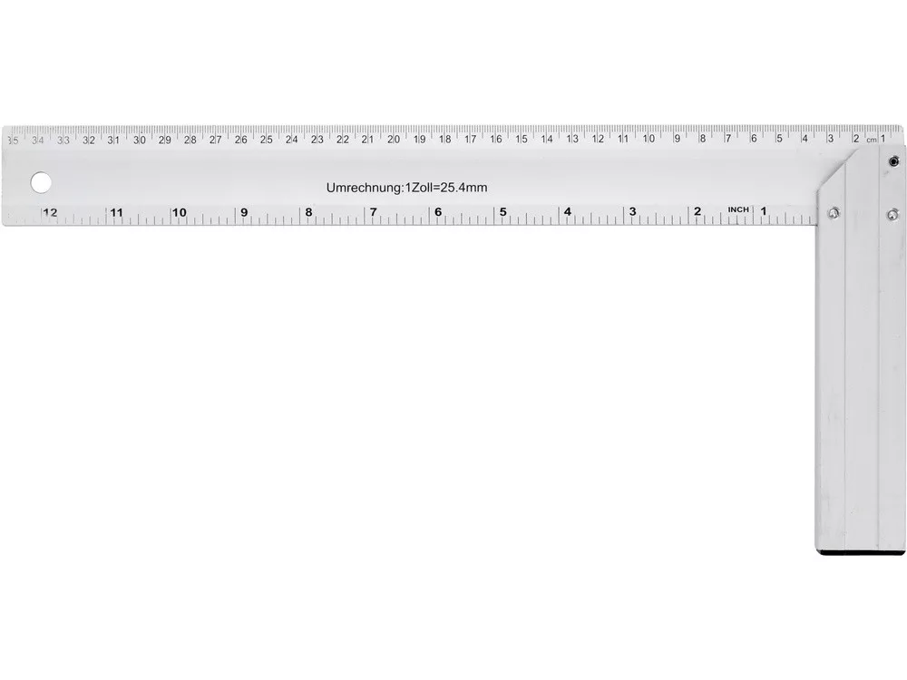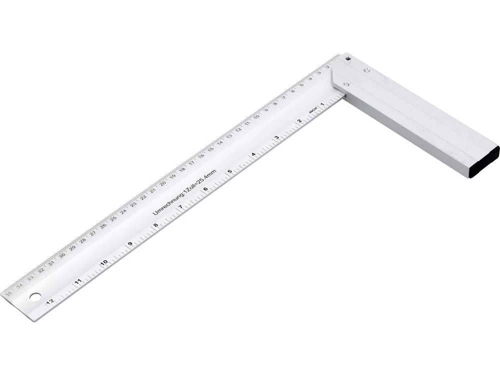 Edzett alumíniumból készült, lábfejjel ellátott derékszög, olvasható fekete milliméteres beosztással. A láb és a kar közötti csatlakozás 45°-os szöget jelöl ki.