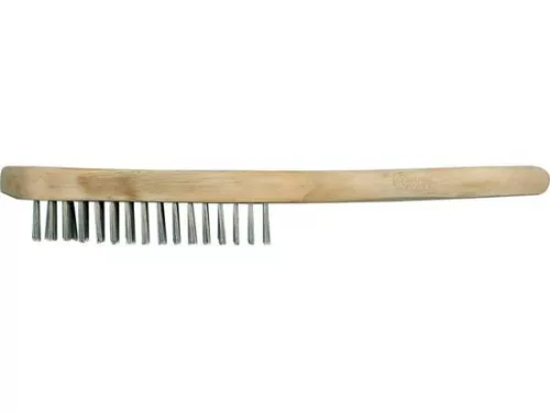 Négysoros drótkefe horganyzott acélhuzalból, fából készült testbe ágyazva.