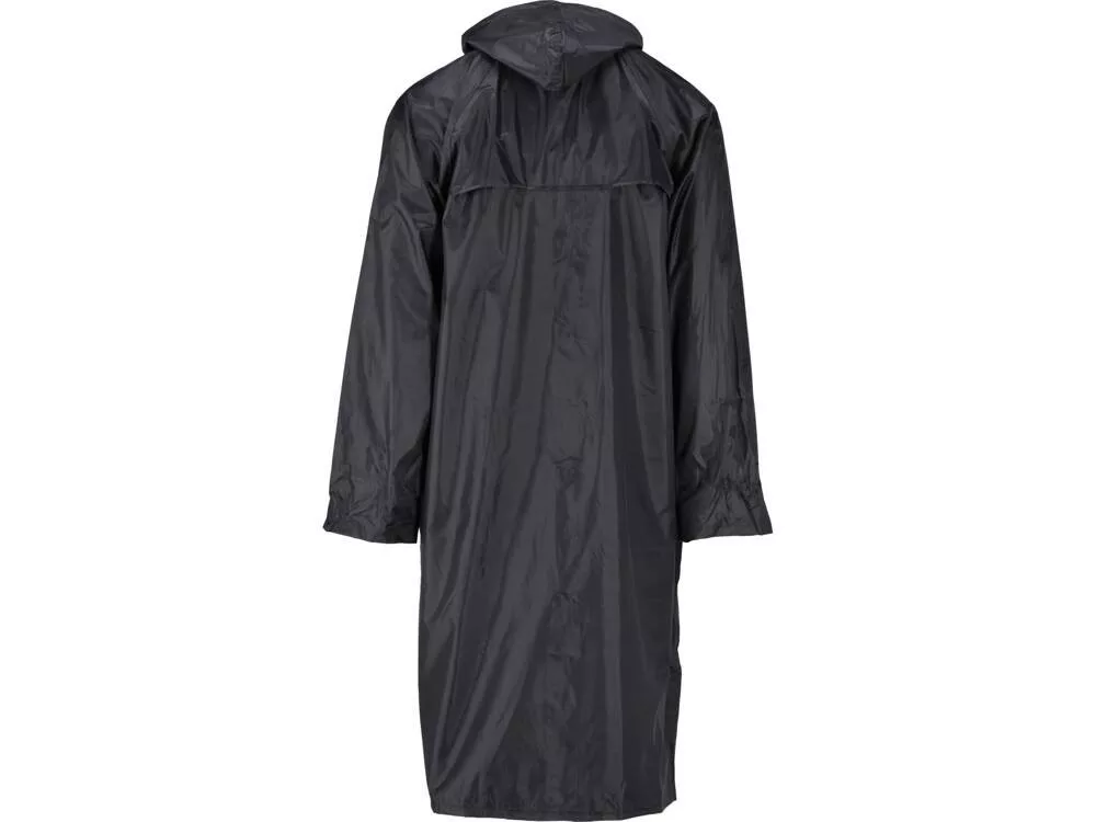 Fekete esőkabát két nagy zsebbel és állítható kapucnival. A PVC/poliészter keverék vízálló és légmentes anyag. A felesleges hő az anyag alól a háton lévő szellőzőnyílásokon és a hónalj alatti karimákon keresztül távozik.