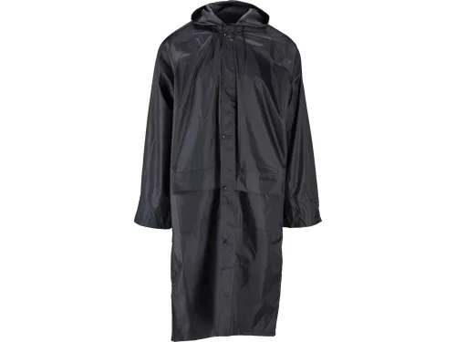 Fekete esőkabát két nagy zsebbel és állítható kapucnival. A PVC/poliészter keverék vízálló és légmentes anyag. A felesleges hő az anyag alól a háton lévő szellőzőnyílásokon és a hónalj alatti karimákon keresztül távozik.
