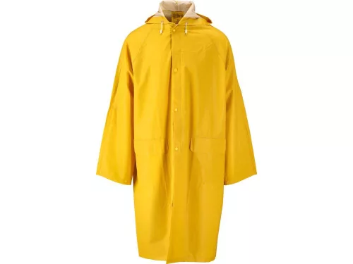 Sárga esőkabát két nagy zsebbel és állítható kapucnival. A PVC/poliészter keverék vízálló és légmentes anyag. A felesleges hő az anyag alól a háton lévő szellőzőnyílásokon és a hónalj alatti karimákon keresztül távozik.