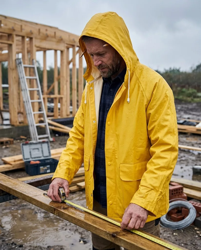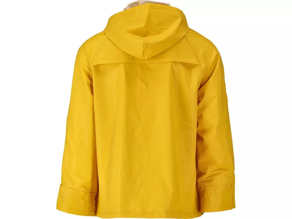 Sárga esőkabát két nagy zsebbel és állítható kapucnival. A PVC/poliészter keverék vízálló és légmentes anyag. A felesleges hő az anyag alól a háton lévő szellőzőnyílásokon és a hónalj alatti karimákon keresztül távozik.