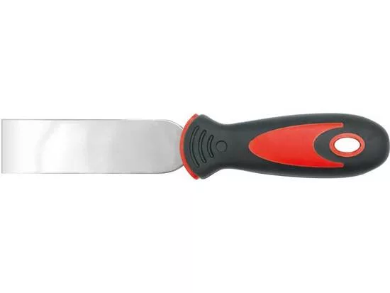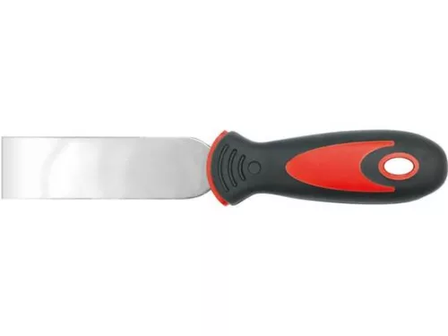 A spatula polírozott rozsdamentes acéllemezből készült. Ergonomikus, kontúros fogantyúval rendelkezik, amelyet két réteg színes műanyag borít, így szilárd és biztonságos fogást biztosít.