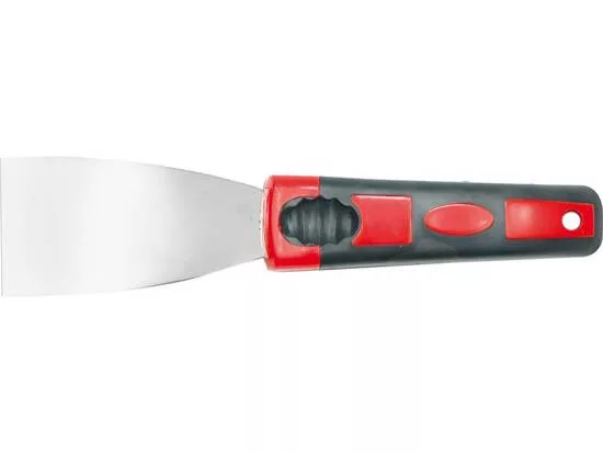A távtartó polírozott rozsdamentes acéllemezből készült. A hajlított nyél, amelyet két réteg különböző keménységű színes műanyaggal borítottak, szilárd és biztonságos fogást tesz lehetővé.