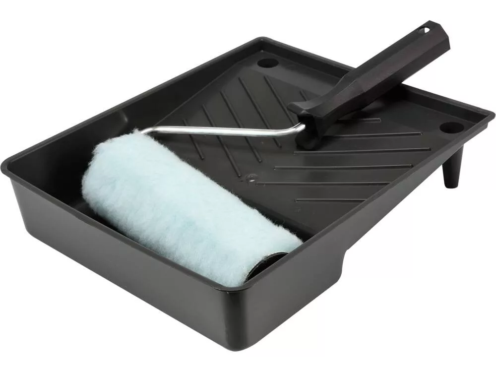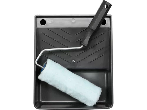 Könnyű, 180 mm hosszú festékhenger, 245x150 mm-es műanyag tálcával, amellyel a hengerből kinyomható a felesleges festék. Készlet sima és porózus felületek festésére használható mindenféle vízbázisú festékkel.