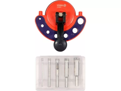 A vezető segítségével precíz furatokat fúrhat kerámialapokba, kőbe, üvegbe és számos egyéb anyagba. A tapadókorong lehetővé teszi a hatékony rögzítést függőleges vagy vízszintes elemeken. Helyezze a vezetőt a csempére úgy, hogy az alján lévő gumi tapadókorong az anyaghoz tapadjon, nyomja meg enyhén, és húzza vissza a test karját. Helyezzen be egy hasonló átmérőjű gyémántfúrófejet a kiválasztott átmérőjű furatba és kezdje el a fúrást. A gyémánt fúrófejek száraz vagy nedves fúráshoz vannak tervezve kerámia burkolólapokban, kőben, márványban