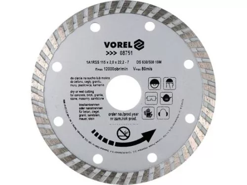 Univerzális gyémánttárcsa sarokcsiszolókhoz. 7 mm magas folyamatos turbó szegmenssel ellátva. Alkalmas "nedves vagy száraz" munkavégzésre. Beton, tégla, kő és egyéb építőanyagok vágásához ajánlott.