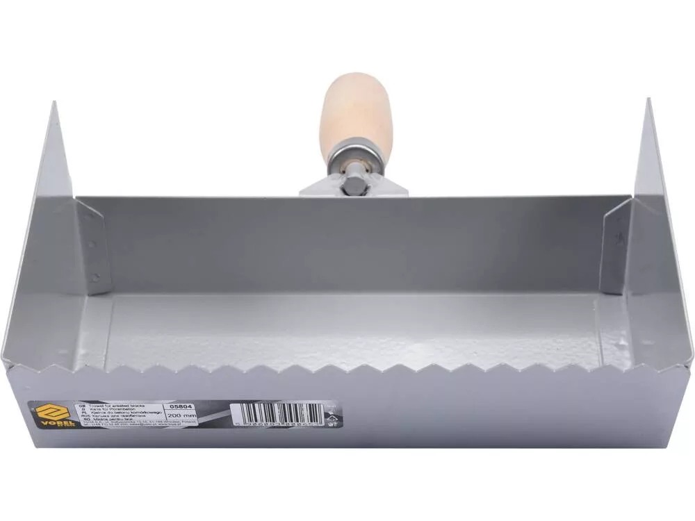 200 mm-es acéllemezből készült habarcsterítő. A habarcs felhordására és szétterítésére szolgál. A speciális kialakítás lehetővé teszi a megfelelő mennyiségű habarcs felvételét, a fogazott él pedig az egyenletes eloszlást.