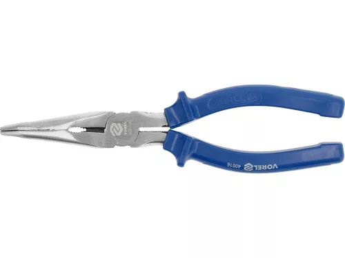 Hajlított csőrű fogó 200 mm. Fogazott pofafelület profilozott pengékkel a drót vágásához. Kényelmes műanyag nyéllel ellátott fogantyúk.