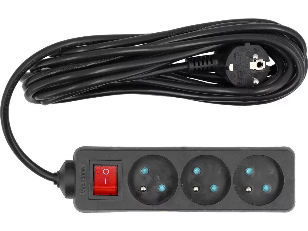 Klasszikus földelt hosszabbító három dugallyal, műanyag aljzatburkolattal, kábel hossza 5 m