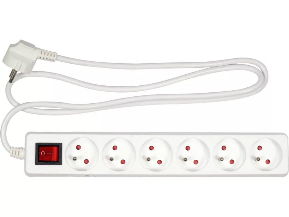 Klasszikus földelt hosszabbító hat dugallyal, műanyag aljzatburkolattal, kábel hossza 1,5 m