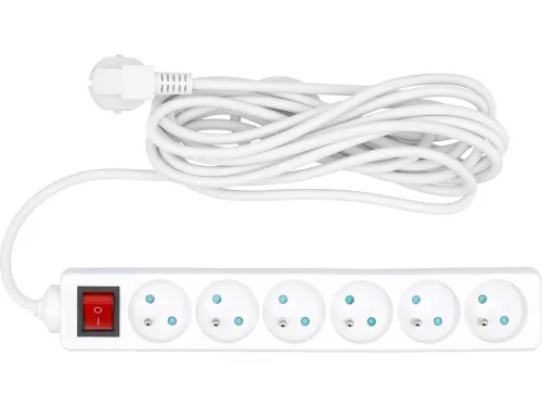 Klasszikus földelt hosszabbító hat dugallyal, műanyag aljzatburkolattal, kábel hossza 5 m