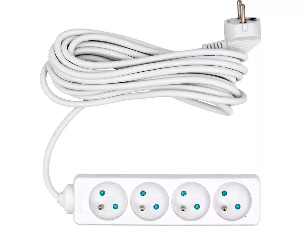 Klasszikus földelt hosszabbító négyes dugallyal, műanyag aljzatburkolattal, kábel hossza 5 m