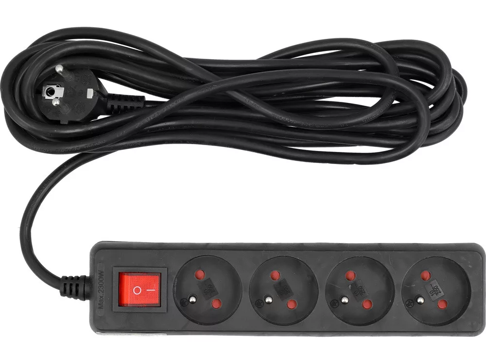 Klasszikus földelt hosszabbító négy dugallyal, műanyag aljzatburkolattal, kábel hossza 5 m