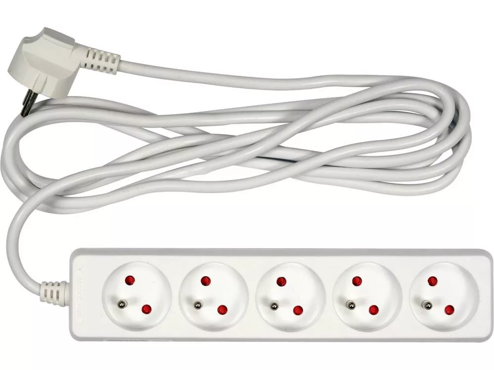 Klasszikus földelt hosszabbító öt dugallyal, műanyag aljzatburkolattal, kábel hossza 3 m