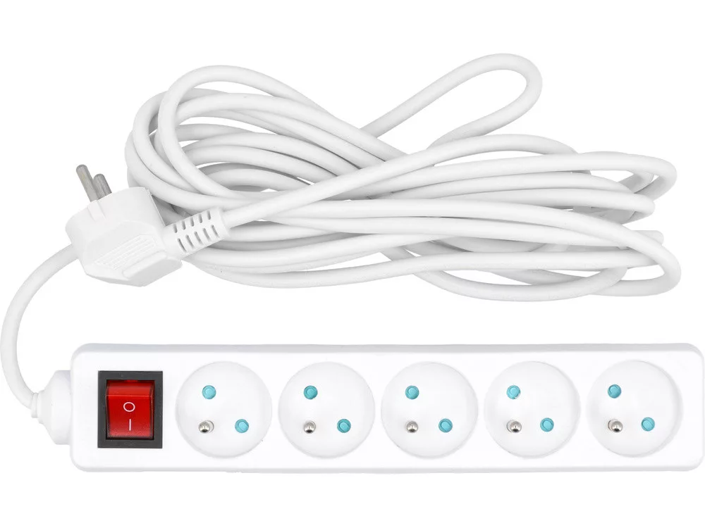Klasszikus földelt hosszabbító öt dugallyal, műanyag aljzatburkolattal, kábel hossza 5 m
