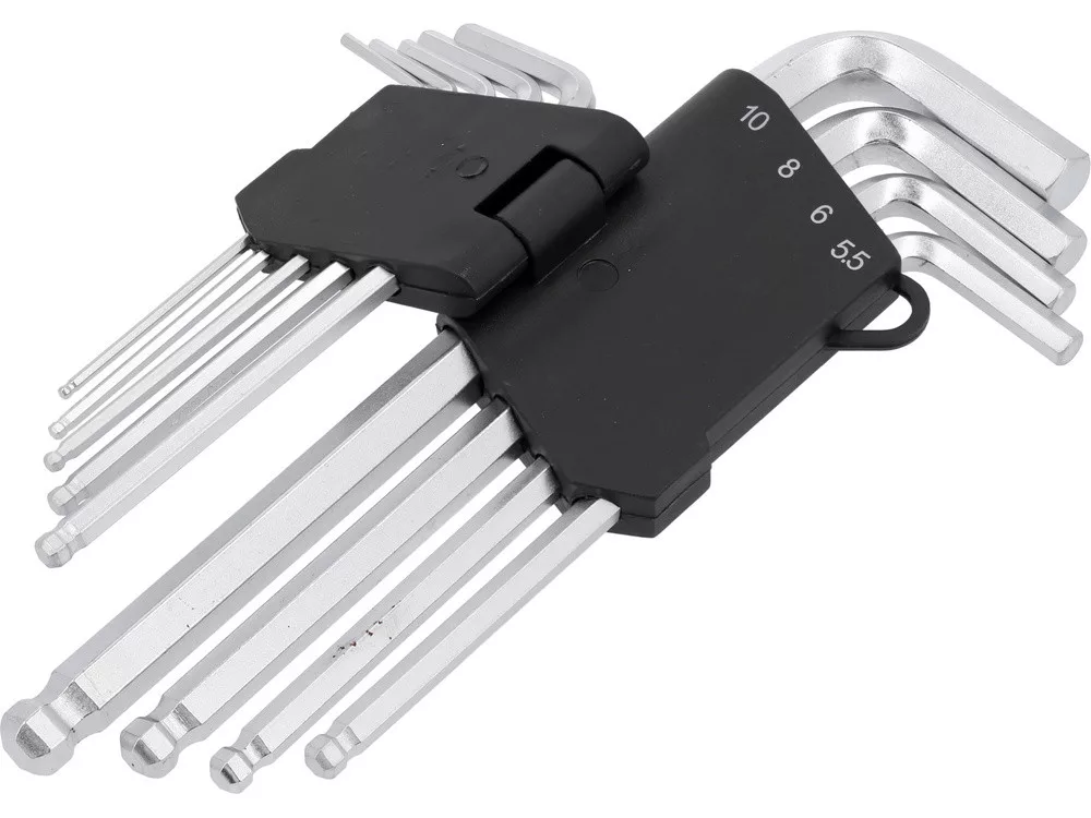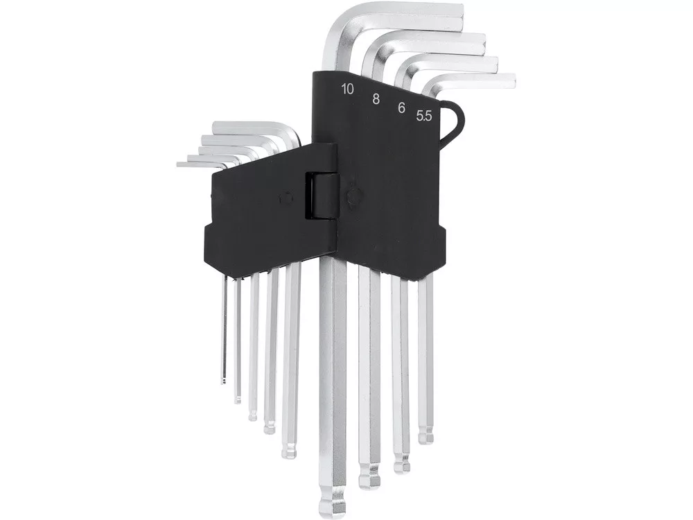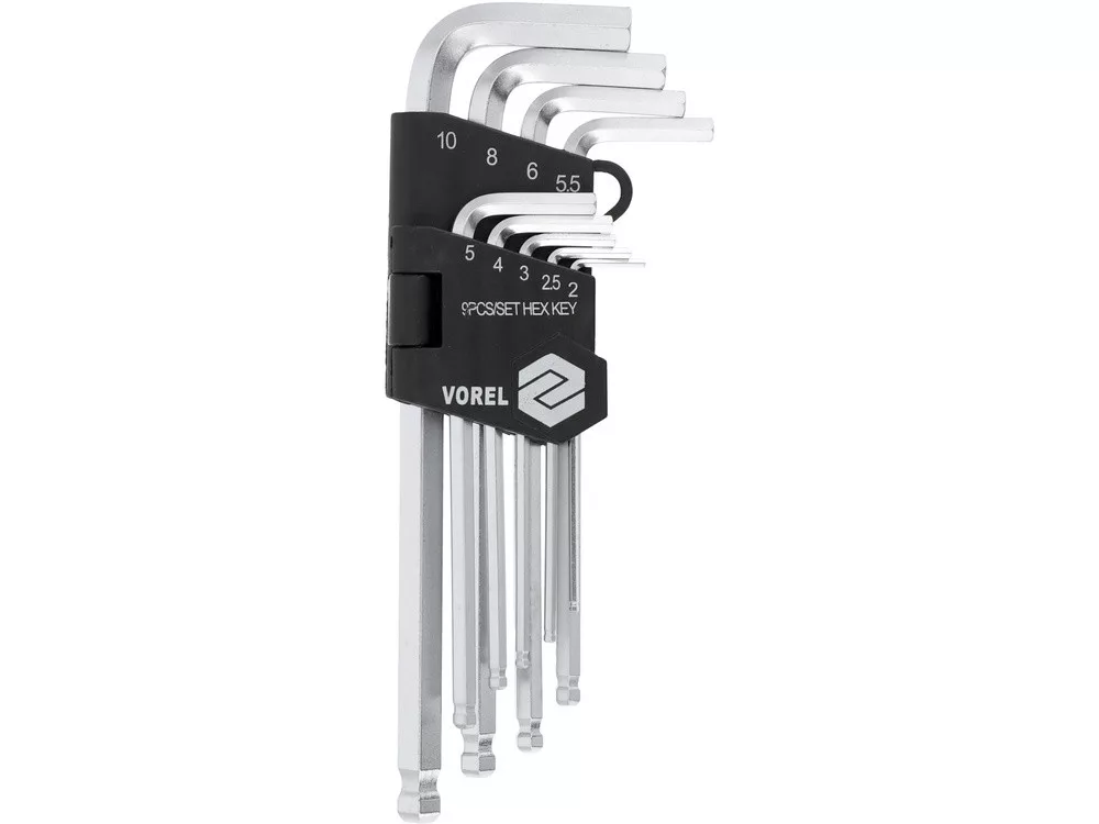 9 részes imbuszkulcs készlet. 2, 2.5, 3, 4, 5, 5,5, 6, 8, 10 mm. Króm-vanádium acélból készült. Szatén kivitelben.