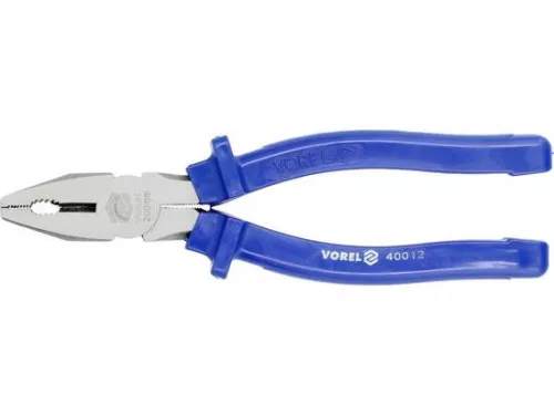 Kombinált fogó 200 mm. Vágóélek drót, szögek vágására alkalmasak. Az pofák felülete fogazott, ami lehetővé teszi a lapos tárgyak és kisebb szerszámok biztonságos megfogását