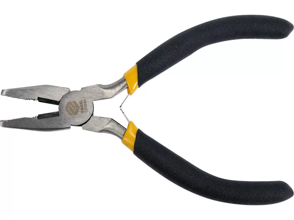 Kombinált fogó rugóval ellátva, fogazott pofafelület profilozott vágóélekkel