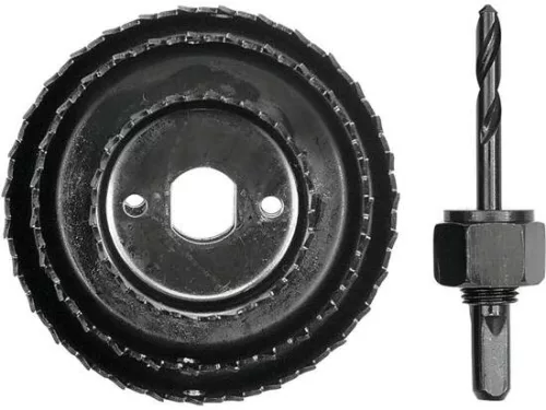 Körkivágó készlet puhább anyagokhoz: fa, forgácslap, rétegelt lemez és gipsz anyagok. Fogantyú centráló fúrószárral a tokmány rögzítéséhez.