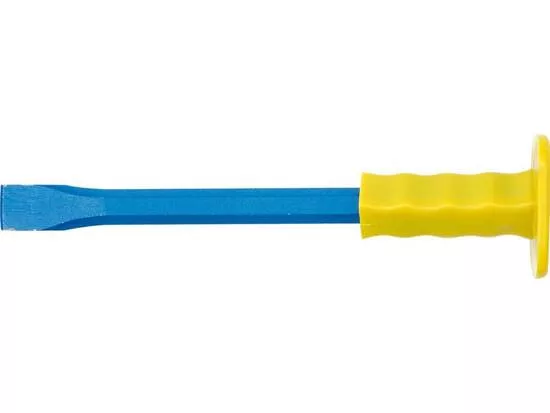 Szénacélból készült véső, edzett munkaszelvénnyel. Kemény műanyag fogantyú a tetején, hogy megvédje a kezet a véletlen ütésektől