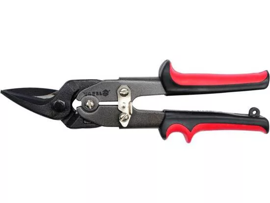 Lemezvágó olló edzettacélból, 56-60HRC keménységgel. Feketített felület. Ergonomikus műanyaggal borított fogantyúk. Pofazárral felszerelve. Legfeljebb 1 mm vastagságú acéllemezek vágásához.