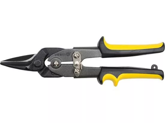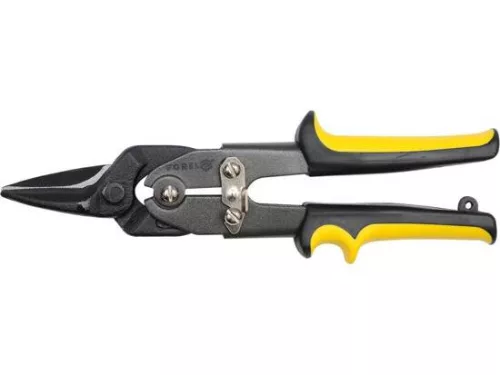 Lemezvágó olló edzettacélból, 56-60HRC keménységgel. Feketített felület. Ergonomikus műanyaggal borított fogantyúk. Pofazárral felszerelve. Legfeljebb 1 mm vastagságú acéllemezek vágásához.