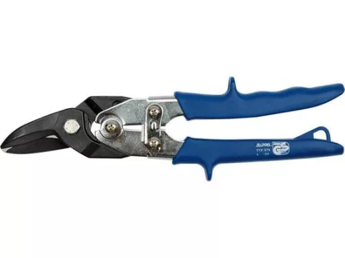 Lemezvágó olló edzettacélból, 54-58 HRC keménységgel. Feketített felület. Ergonomikus műanyaggal borított fogantyúk. Pofazárral felszerelve. Legfeljebb 1,5 mm vastagságú acéllemezek vágásához.