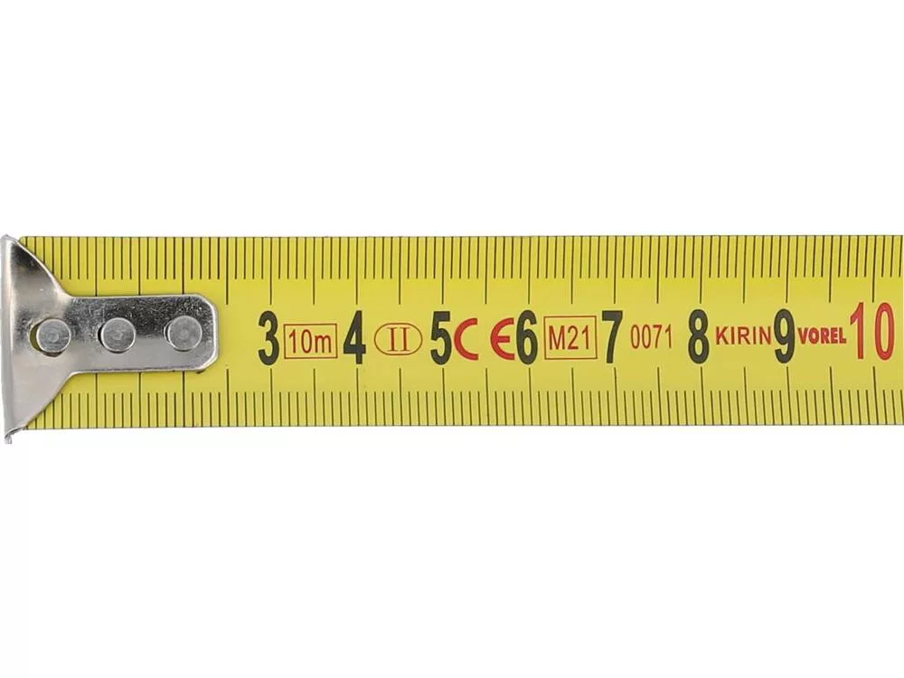 10 mx25 mm-es tekercselt acél mérőszalag II. pontossági osztályban. A mérőszalag két zárral van felszerelve: egy fix, csúszógombos és egy üveges, a mérőszalag alján lévő gombbal. Akár 1000 cm-es távolságok pontos méréséhez