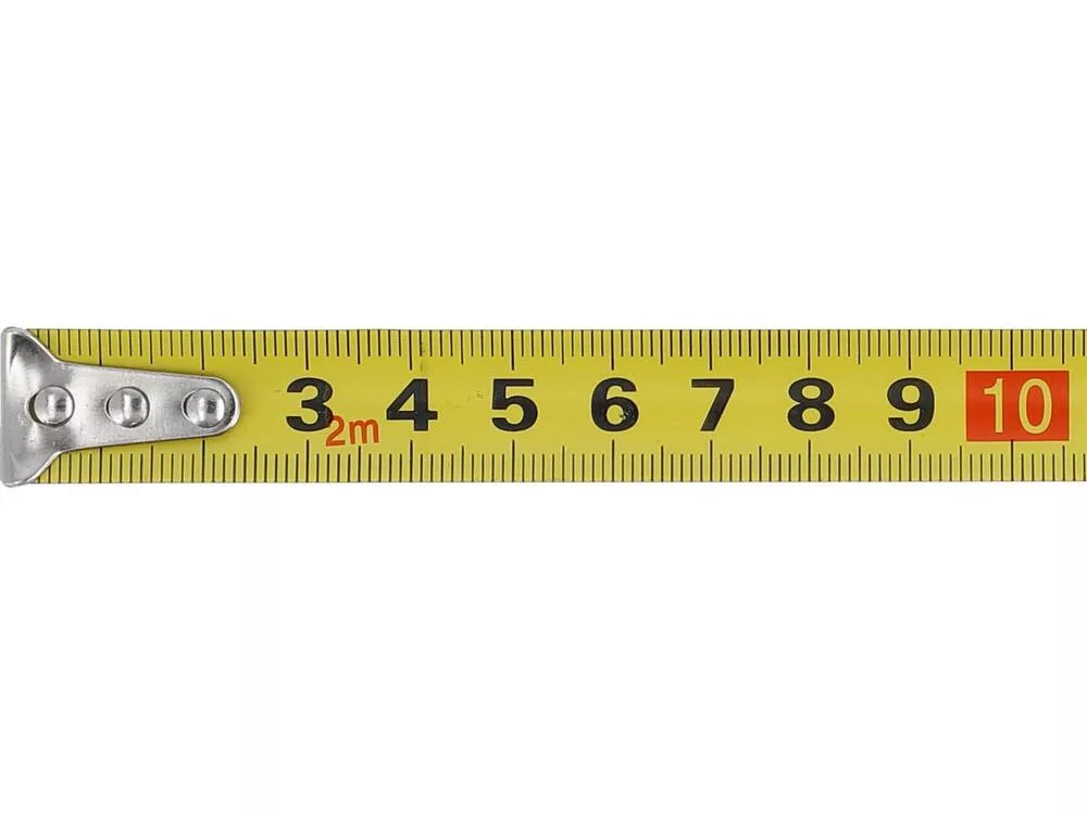 2 m hosszú és 16 mm széles acélpánt, amely mozgatható kampóban végződik. A zárógombbal ellátott ház műanyagból készült, gumibetétekkel megerősített. A kazettán egy talpelem van a rögzítéshez. Gyors, pontos mérésekhez 2 m-ig.
