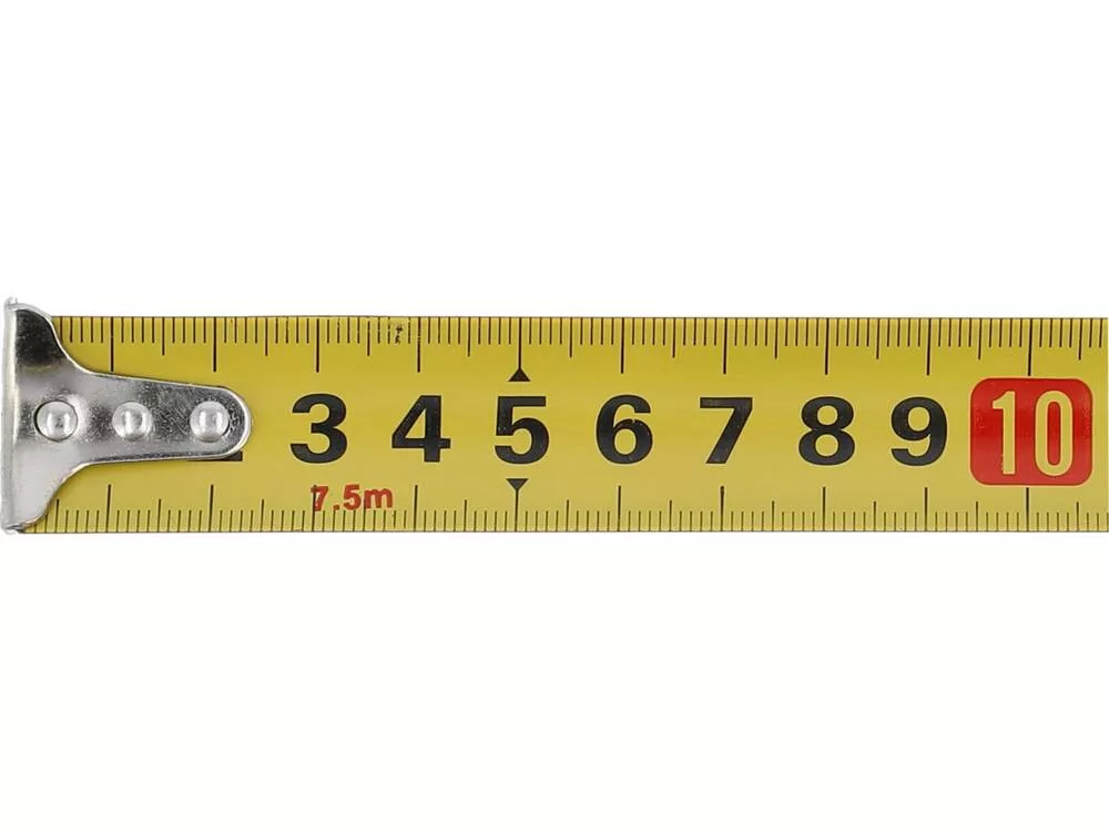 7,5 m hosszú és 25 mm széles acélpánt, amely mozgatható kampóban végződik. A zárógombbal ellátott ház műanyagból készült, gumibetétekkel megerősített. A kazettán egy talpelem van a rögzítéshez. Gyors, pontos mérésekhez 7,5 m-ig.