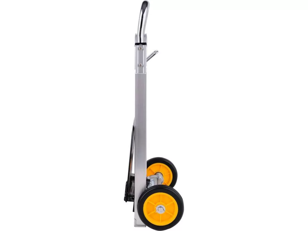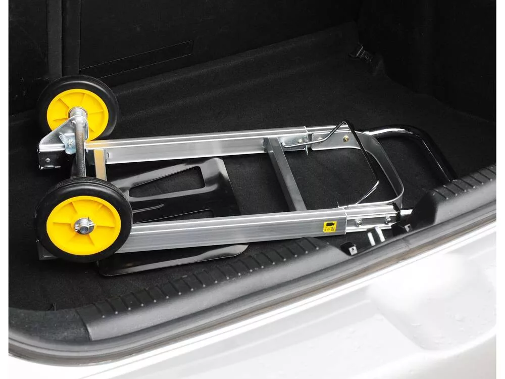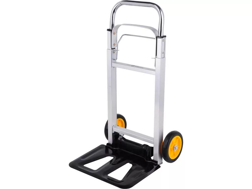 Összecsukható szállítókocsi 90 kg teherbírással. A 355x240 mm-es nagyméretű acél rakodólap lehetővé teszi különböző méretű kartondobozok, ládák vagy konténerek rakodását. A gyorsan összecsukható rendszernek köszönhetően a rakodólap egyetlen mozdulattal összecsukható. A reteszelőrendszerrel ellátott teleszkópos fogantyú kihajtva eléri az 1080 mm-es teljes hosszúságot, lehetővé téve az ergonomikus szállítást túlzott erőfeszítés nélkül. Ezenkívül a felszerelt stabil keresztrúd megkönnyíti a teher emelését. Ennek a kocsinak jelentős előnye a kompakt kialakítás. Összecsukott állapotban 190x710x390mm-es méretekkel rendelkezik. Így nagyon könnyen tárolható vagy szállítható, és bármely autó csomagtartójába könnyedén befér. A 150 mm átmérőjű PP + EVA anyagból készült kerekek kopásállóak. A mindössze 4,3 kg súlyú, könnyű alumíniumszerkezet pedig hosszú élettartamot biztosít.
