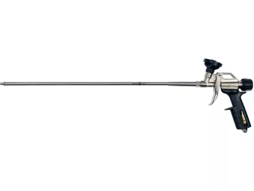 PTFE-réteggel borított pisztolytartó, mely csökkenti a hab megtapadását, a pisztoly tisztításához szükséges időt. 500 mm-es lándzsa hossza megkönnyíti a hab felhordását a nehezen hozzáférhető helyeken. Anyag: alumínium Felületkezelés: PTFE bevonattal Fogantyú anyaga: PVC Alkalmazás: építőipari, szerelési, szigetelési munkák