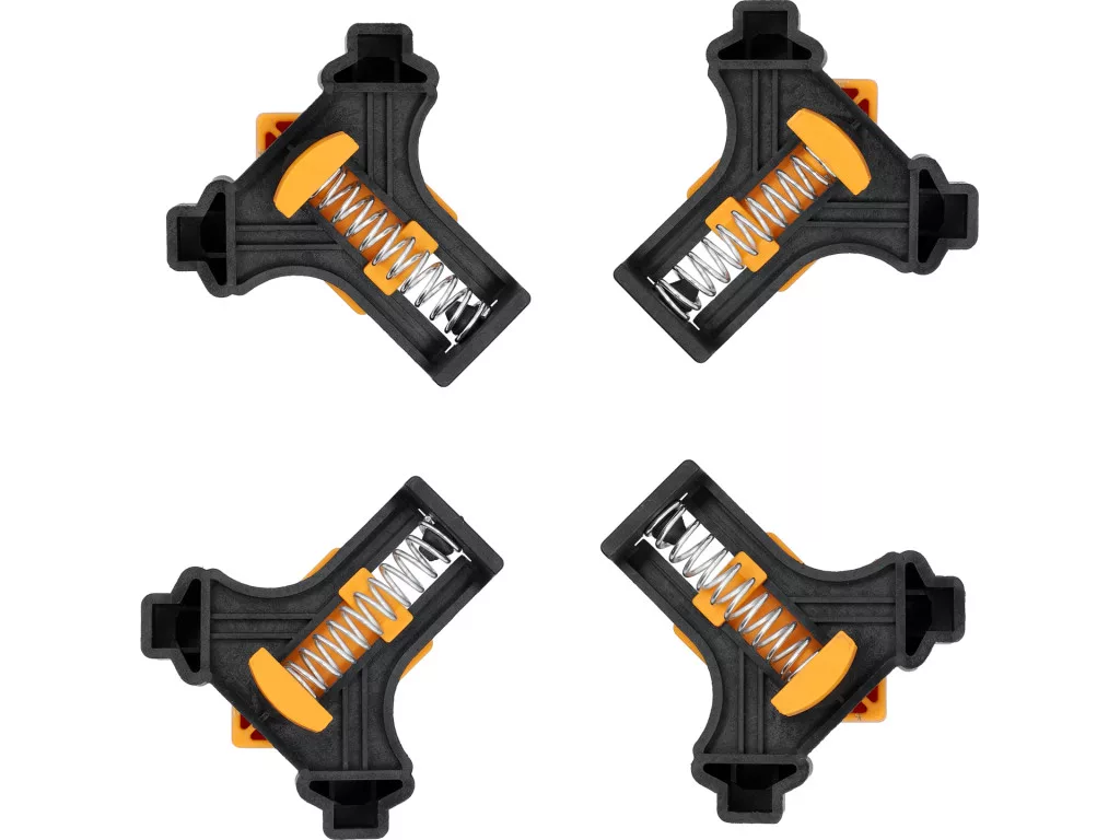 Rugós szögfogó készlet (4 db): 90°-os szögekhez 5-22 mm befogás, max 15 kg nyomóerő, nylon test; könnyű egy kézzel, gyors pontos sarkbeállítás asztalos és szerelési feladatokhoz.