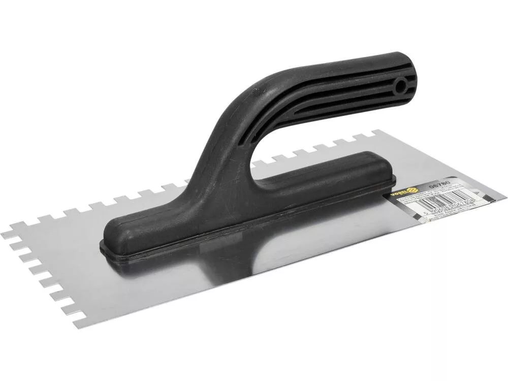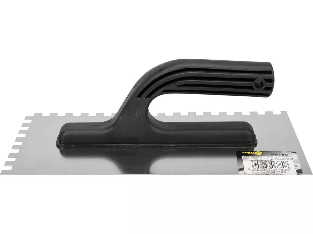 270x125 mm méretű, rozsdamentes acéllemezből készült, 8 mm-es fogazattal ellátott. Kényelmes és könnyű műanyag fogantyú. Elengedhetetlen ragasztók, vakolatok és alapozók felhordásakor.
