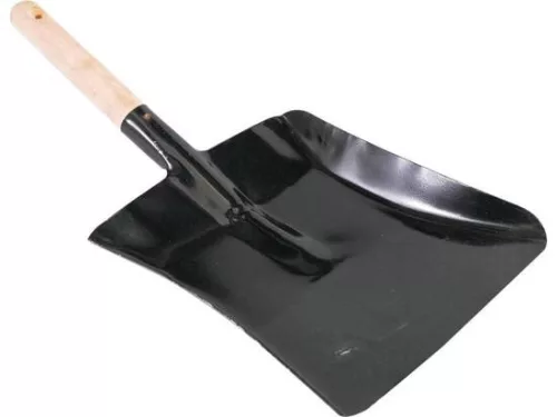 Széles szeneslapát 460x240x220 mm. Lakkozott fémlemezből készült, keményfa nyéllel.