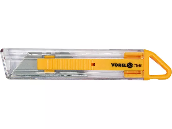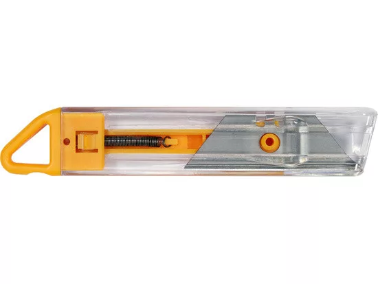 Kés kihúzható trapéz alakú pengével. A rugós mechanizmus visszahúzza a pengét a markolatba, amikor a felhasználó elengedi a csúszót. A test strapabíró ABS műanyagból készült.