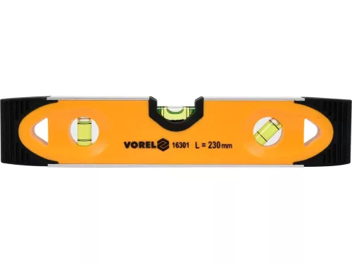 Vízmérték egyszerű mérési munkákhoz. Mechanikai sérüléseknek ellenálló test, ABS műanyag. 3 fiolával rendelkezik - 0˚, 90˚ és 45˚. Mágneses talppal ellátott.