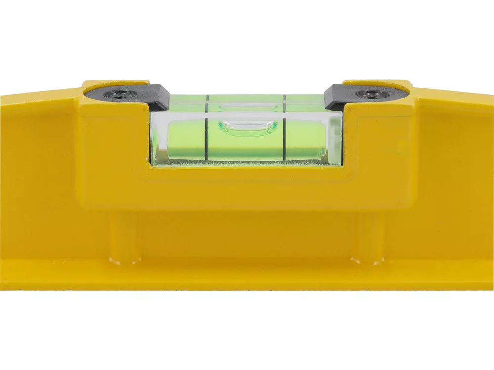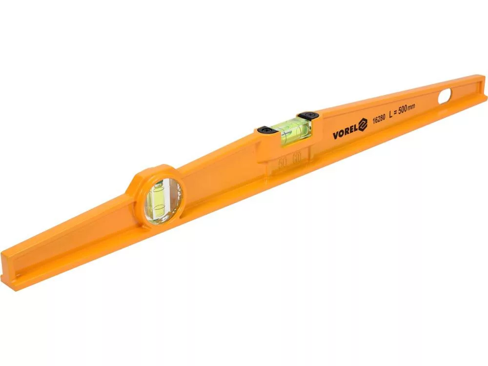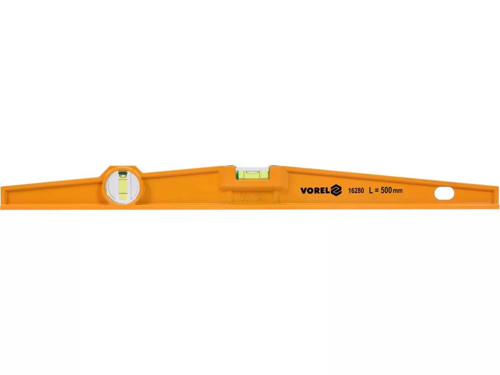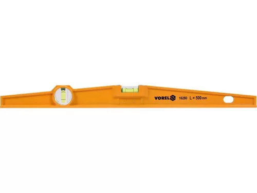 Trapéz alakú vízmérték a precíz mérési munkákhoz. Ellenáll a mechanikai sérüléseknek, teste öntött alumíniumból készült. Két fiola a vízszintes és függőleges vonaljelöléshez, a ház teljes hossza 500 mm
