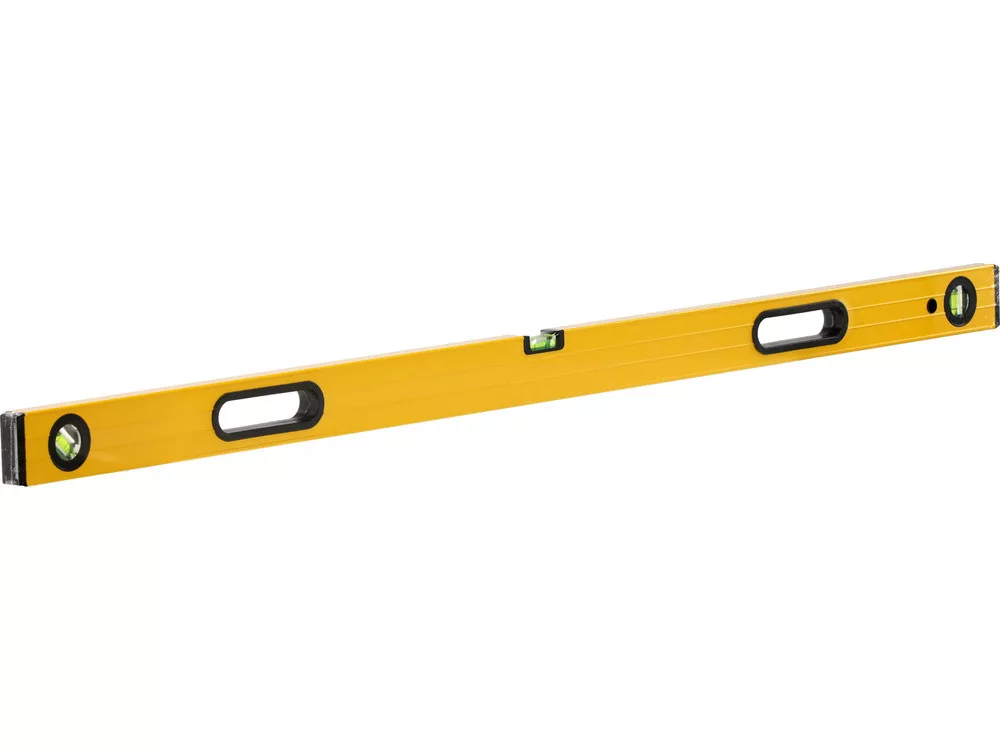 Alumínium profilból készült, két fogantyúval és három fiolával rendelkezik a függőleges, vízszintes és 45 fokos szög meghatározásához. Rugalmas műanyag betétekkel védett végek.