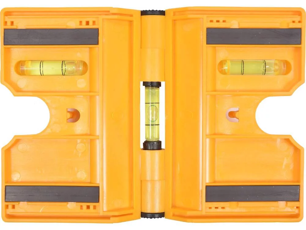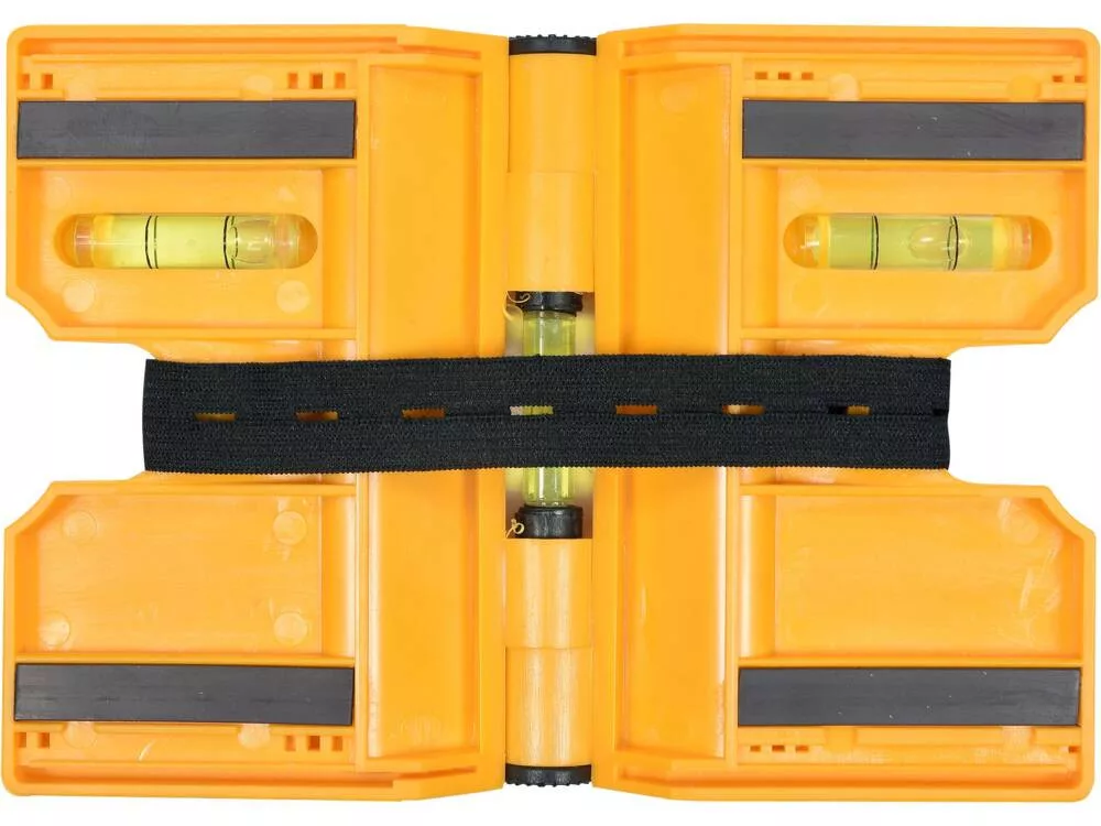 Vízmérték három fiolával és mágnesekkel az oszlopok beállításához. A csukló lehetővé teszi a pontos beállítást a felszerelendő oszlophoz. Mágnesek vagy rugalmas szalag segítségével rögzíthető az oszlophoz.