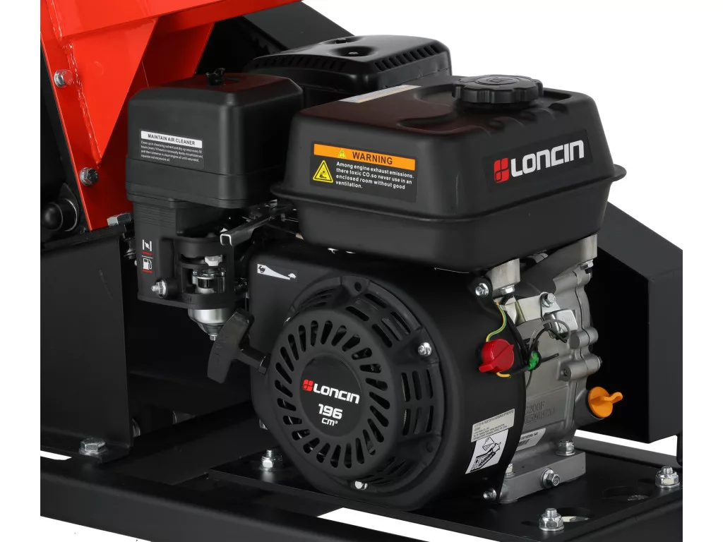 Átgondolt felépítés, Loncin 6,5 LE/196 cm³ motor, 6 vágóél, max 60 mm, szíjhajtás, 2 m³/h, forgács 50-80 mm; kompakt, strapabíró, ágak aprítására és mulcsozásra.