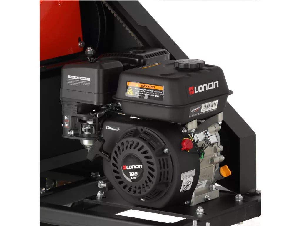 Loncin 196 cm³-es, 6,5 LE-s benzinmotoros, szíjhajtású aprító, 80 mm-ig vág, 4 m³/h, 6 kés, 60-120 mm darabok, nagy kerekekkel