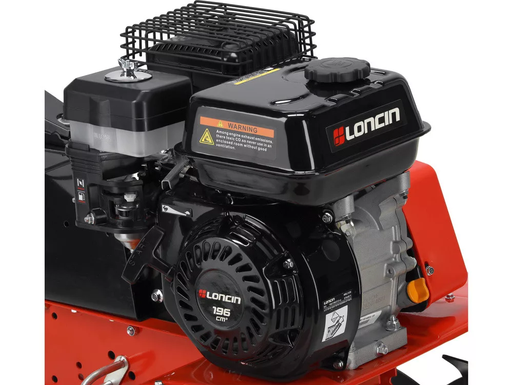 Benzines kapálógép, 196 cm³-es LONCIN belső égésű motorral, 850 mm munkaszélességgel, 3 fokozatú mélységállítással.
