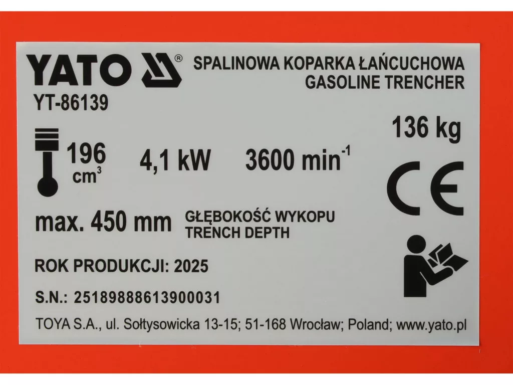 YATO YT-86139 benzinmotoros láncos árokásó: keskeny, egyenes árkokat készít gyorsan és ismételhető pontossággal; 100 mm szélesség, 450 mm mélység; Loncin G200F, 196 cm³, 6,5 KM; lineáris vezetés.
