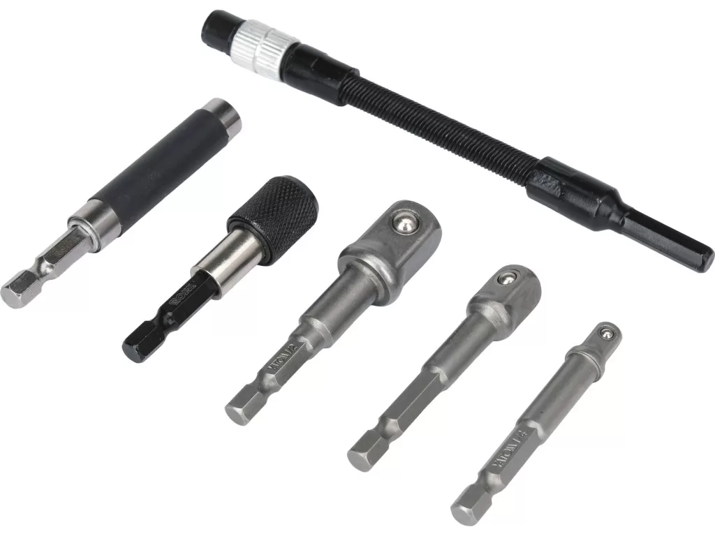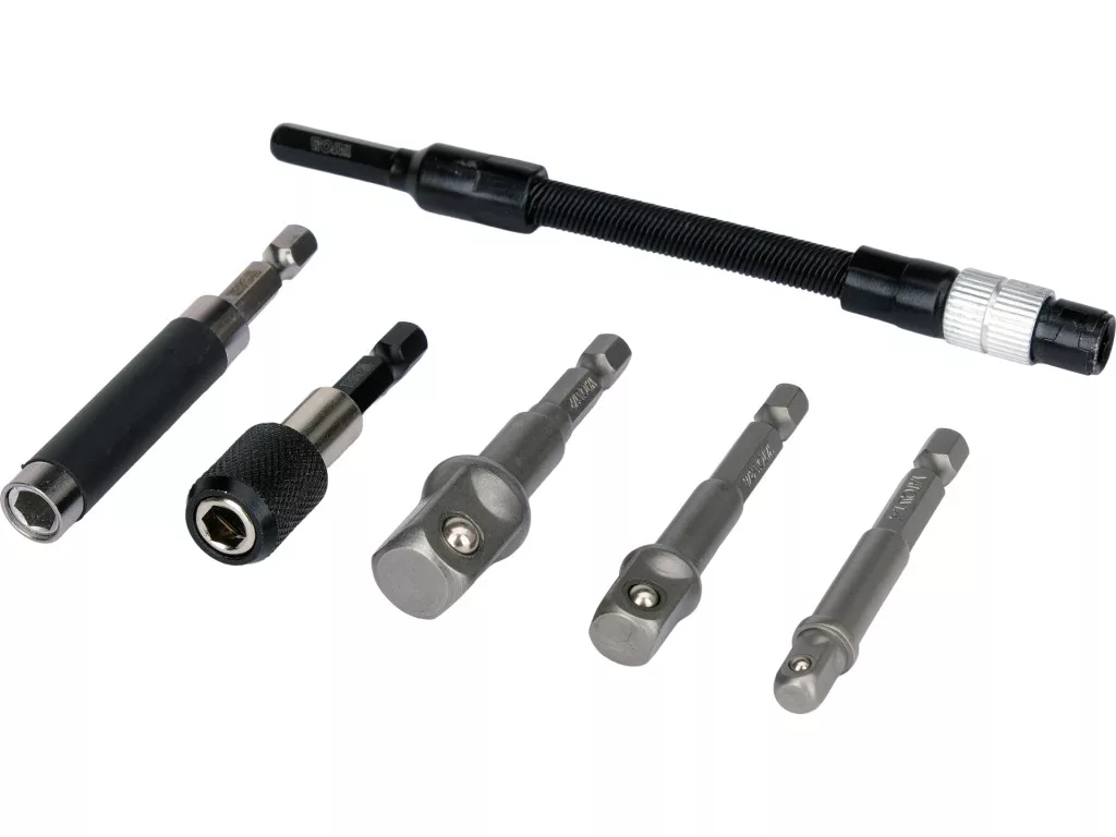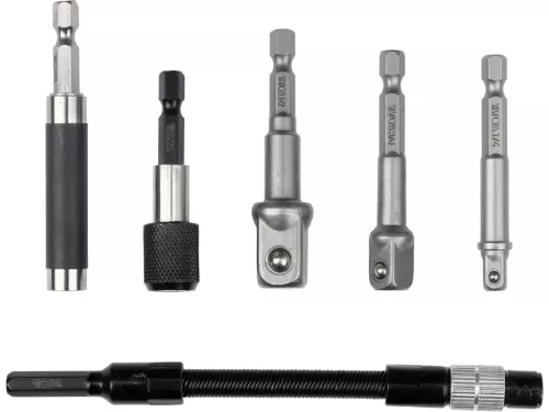 Gyakorlati adapterkészlet csavarozó-fúró gépekhez, 1/4"-os HEX befogással, amely gyorsan bővíti a lehetőségeket 1/4", 3/8", 1/2" adapterekkel és rugalmas hosszabbítóval megkönnyíti a hozzáférést.
