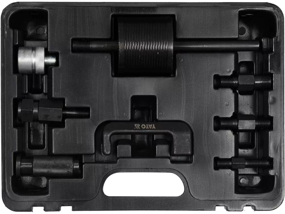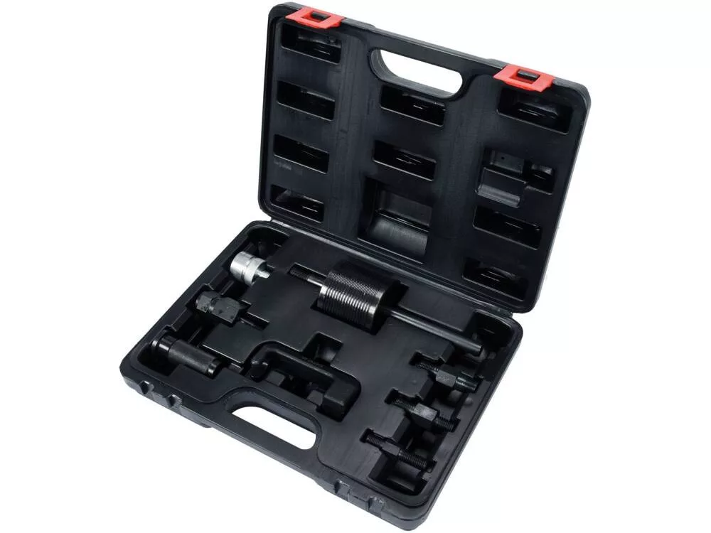 Professzionális készlet a Common Rail üzemanyagrendszer-befecskendezők gyors leszereléséhez Mercedes CDI autók motorfejéből . Olyan gyártók befecskendezőihez illeszkedik, mint a Bosch, Denso, Delphi és Siemens . A készlet 8 elemet tartalmaz : csúszósúly, csukló a nehezen elérhető helyeken történő munkához és adapterek.