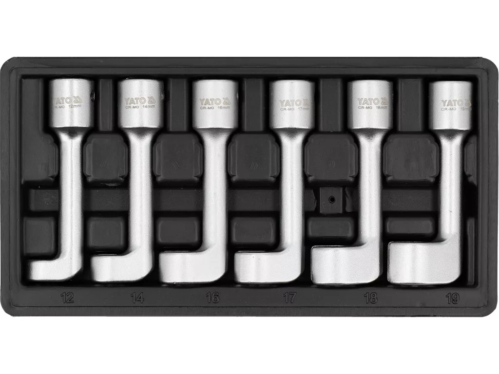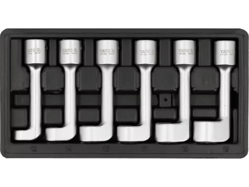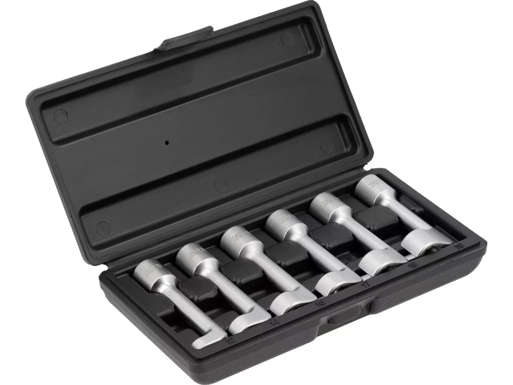 Ez a készlet üzemanyag-injektor vonalakhoz készült, jól profilozott kulcsokból álló segédeszköz, amely a legtöbb magas nyomású rendszer karbantartási feladataihoz nyújt gyakorlati megoldást. A kivitel 1/2"-os meghajtásra adaptált, így a szilárd erőátvitel és a szabványos racsnikkal való zökkenőmentes együttműködés biztosított. A készlet hat darabos, és a következő méretekben tartalmaz kulcsokat: 12, 14, 16, 17, 18 és 19 mm. Ezek a méretek lehetővé teszik a különböző típusú üzemanyag-injektor vonalakhoz való alkalmazkodást, ezáltal széles körű kompatibilitást nyújtanak a különböző rendszerekhez.