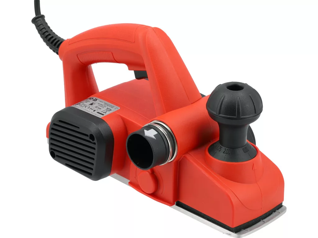 Kézi elektromos gyalu fa- és faforgács-alapú anyagok megmunkálására, sík felületekhez és csapok készítéséhez; 650 W, 16000 min-1, 82 mm szélesség, 0-2 mm mélység, forgácselszívó, irányváltó, 3 m kábel.